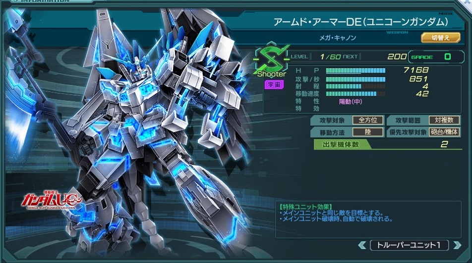 | 特殊ユニット効果 | ・メインユニットと同じ敵を目標とする。 ・メインユニット破壊時、自動で破壊される。 | |||