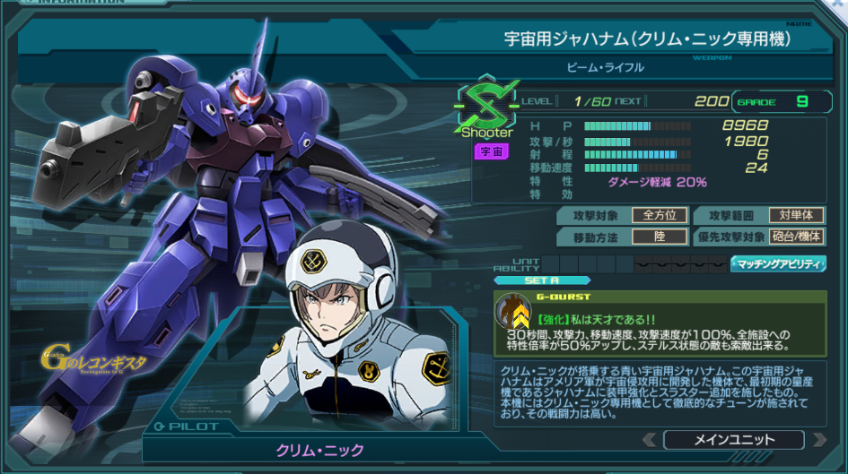 | Shooter | 特性 | 回避(一部除く)60% 命中50% ダメージ軽減20% 敵ACE・MAと対峙する度5秒間、通常攻撃と攻撃Gバーストから 受けるダメージ上限:2000を得る。※発動毎にリセット ACE・MAx2 | ||