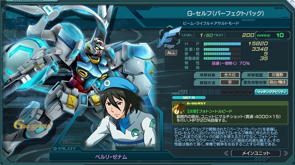 | Flier | 特性 | 回避(一部除く) 70% 攻撃Gバーストで敵を破壊する度、HP回復1000 一度だけGバースト使用後に、Gバーストゲージが100%上昇する ACE・MA×2 | ||