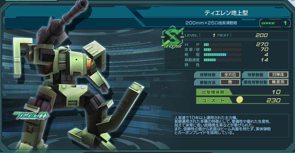足回りも悪いのがネック。総合火力だと機体数が多いザクⅡやトーラスのほうが優位だったりと悲しい機体。