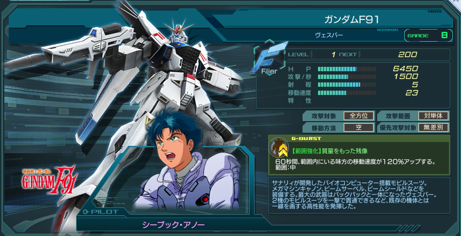 特別任務/フォーミュラ計画にて追加された専用Gバーストはトルーパーユニットとしてヘビーガンを1機召喚。F91自身は射程+1される。