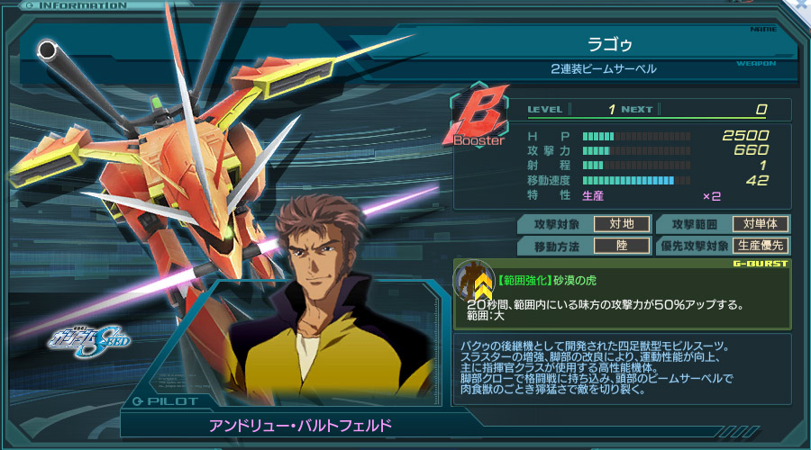 足が速いためG型はもちろん、同じB型量産機を壁として使うことも考慮しておきたいところ。