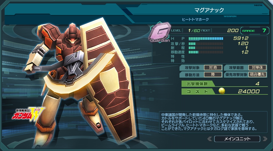 型式番号 WMS-03 中東諸国が対OZに独自開発した局地戦用MS。「マグアナック」とはタガログ語で「家族」を意味する。 かつてガンダムサンドロックのパイロット、カトル・ラバーバ・ウィナーに命を救われた恩により、カトルを「カトル様」と呼んで慕う40人のマグアナック隊が搭乗した。 本編の数年前に地球での再会を約束し、連合・OZと戦うカトルの下に馳せ参じた。 機体性能はリーオーと同程度かちょっと良い程度だがパイロットの熟練度とチームワークにより敵部隊を圧倒する。 ベース機は同一であるが、全機が各パイロットによるカスタマイズが加えられているため、実際はゲーム上と違い1機として同一の機体は存在しない。