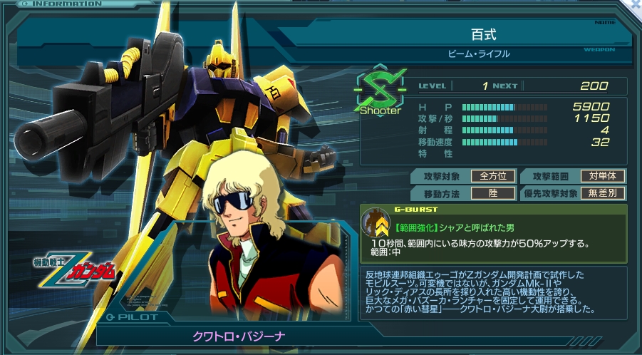 | - | - | 百式(ビーム・ライフル) | S | 5900 | 1150 | 4 | 32 | - | 無差別 | 【範囲強化】攻撃力 | 1d01h33m |
