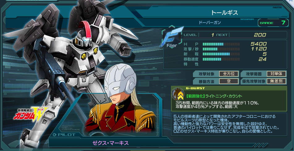 スペックはウイングガンダム(EW版)と同等。射程は5。