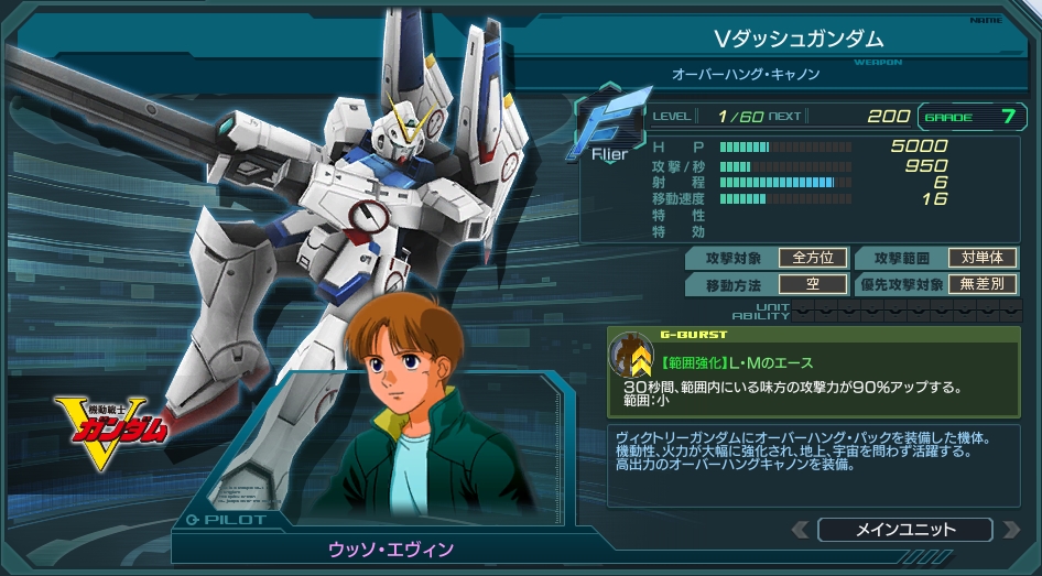 しかし射程が6と大幅延長され、攻撃間隔1.5秒に移動力大幅減少と運用面はVガンダムとほぼ別モノになっている。