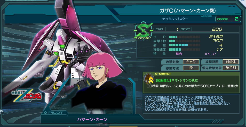 専用Gバーストになると範囲強化の攻撃力アップの効果値上昇に加えて、自身の移動速度と攻撃速度が強化されるので、