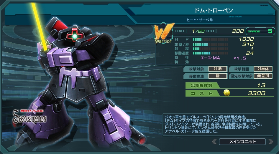 スペックも機体数を考えると安定しており、その上でドム同様の移動速度24が光る。