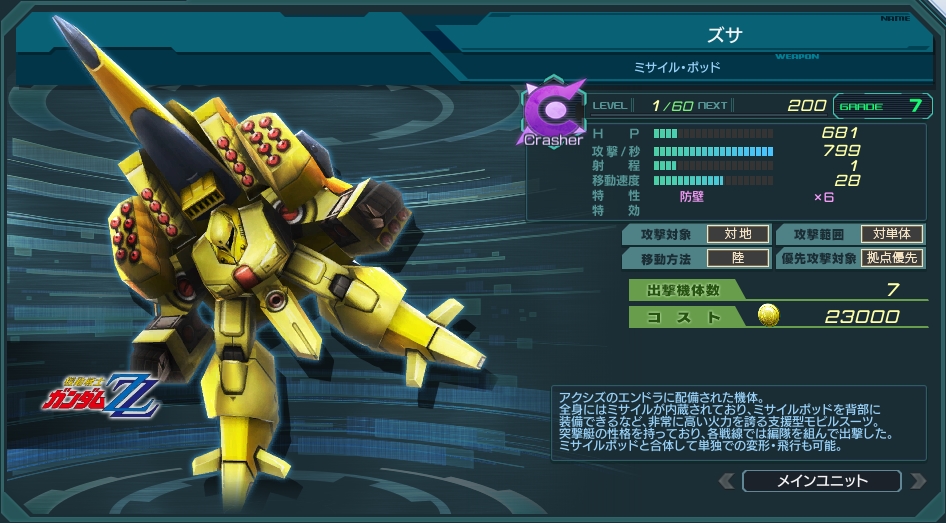 運用方法は変わらずに、HPの向上で一撃では落ちなくなっているのは利点。攻撃力もハイザックの1.5倍以上あるためコア破壊後の掃討戦も楽になる。