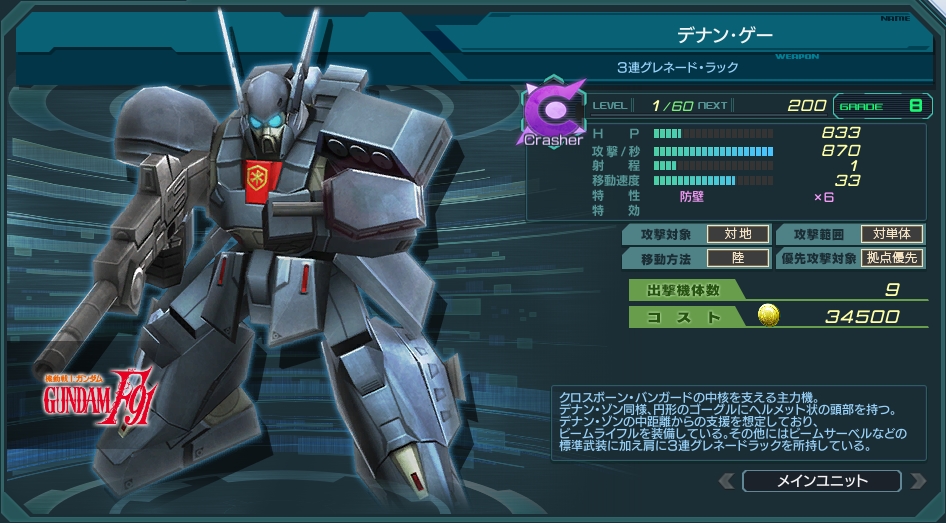 初期機体数がハイザック並に多く、単純火力も高い。さらに移動速度もC型2番目の快速機なので、後発からの拠点破壊を容易にしている。