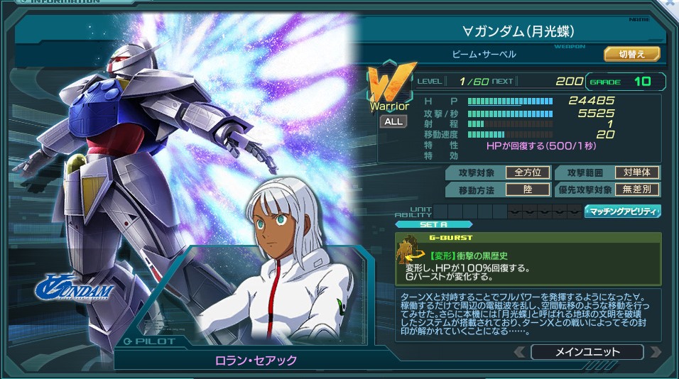 一覧 量産機 | エース | MA 最終ステータス 量産機 | エース | MA 比較データ エースGバースト | シリーズ別早見表 | 特性早見表| MS索引 赤字はレベルアップによるMAX値 基本ステータス