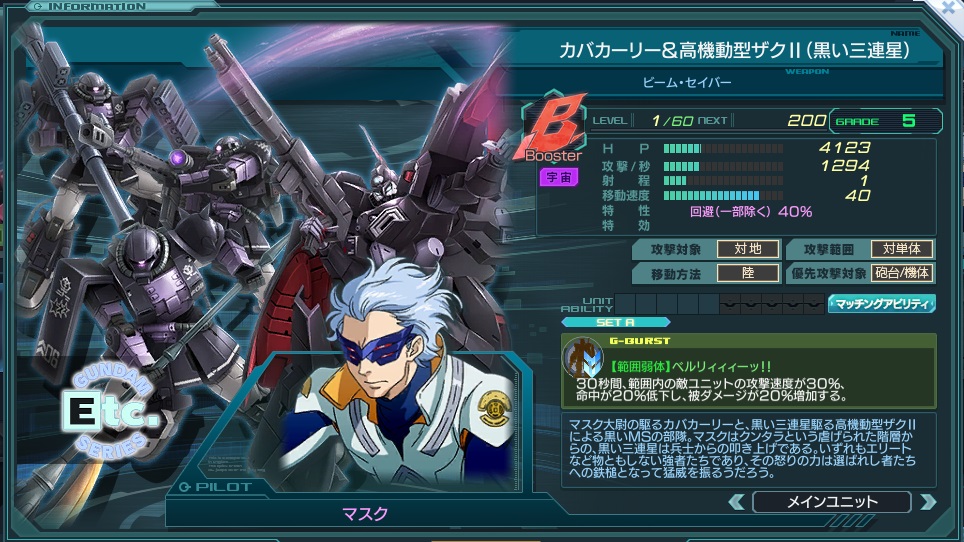 一覧 量産機 | エース | MA 最終ステータス 量産機 | エース | MA 比較データ エースGバースト | シリーズ別早見表 | 特性早見表| MS索引 赤字はレベルアップによるMAX値 基本ステータス