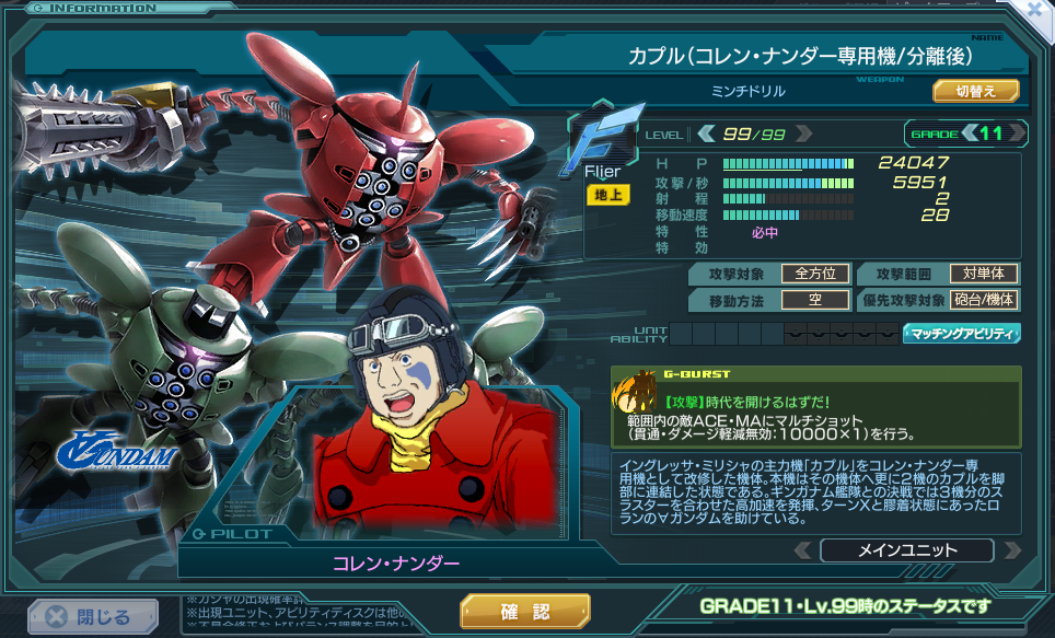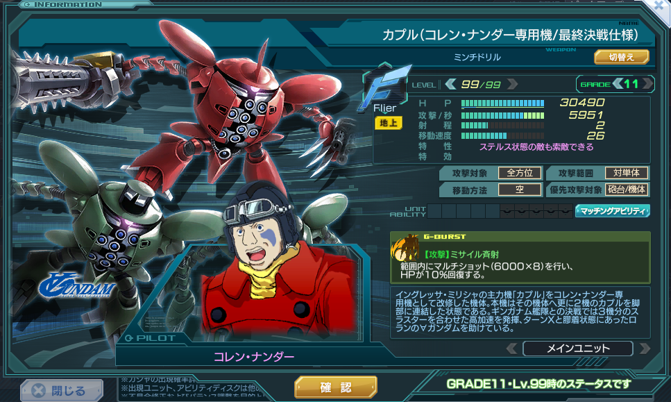 | Flier | 特性 | 被ダメージ増加50% 回避40% ※G11で50% 必中 ステルス状態の敵も索敵できる 分離後に一度だけ、Gバーストゲージが100%上昇する ※分離後も状態引き継ぐ エース・MA×2.5 | ||
