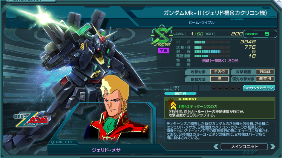 一覧 量産機 | エース | MA 最終ステータス 量産機 | エース | MA 比較データ エースGバースト | シリーズ別早見表 | 特性早見表| MS索引 赤字はレベルアップによるMAX値 基本ステータス