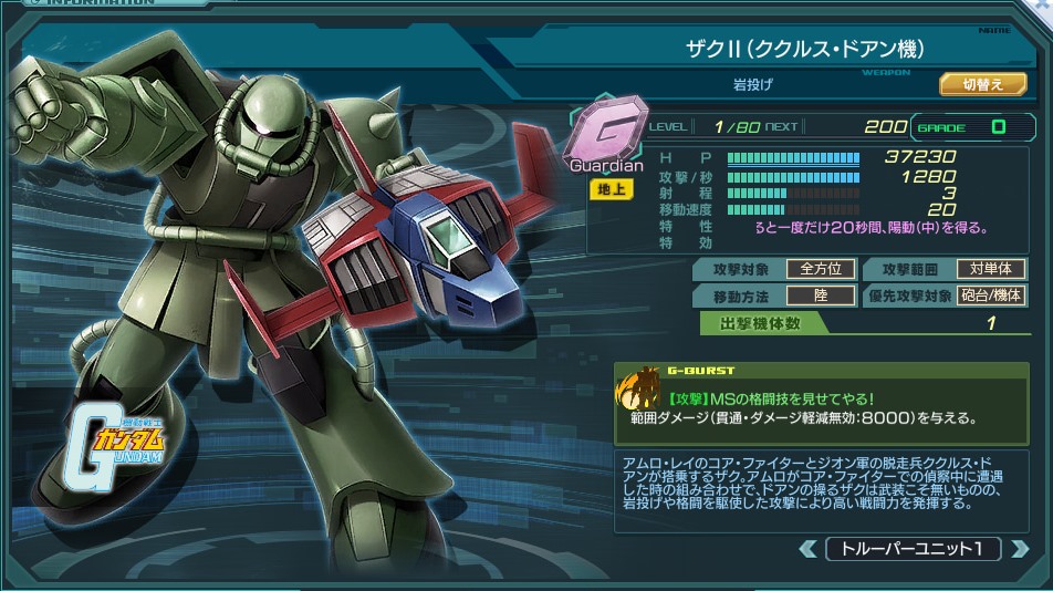 | Guardianx1 | 特性 | 命中80% ダメージ軽減50% メインがGバーストを使用すると一度だけ20秒間、移動速度+100% メインがGバーストを使用すると一度だけ20秒間、陽動(中)を得る。 ACEx3 | ||