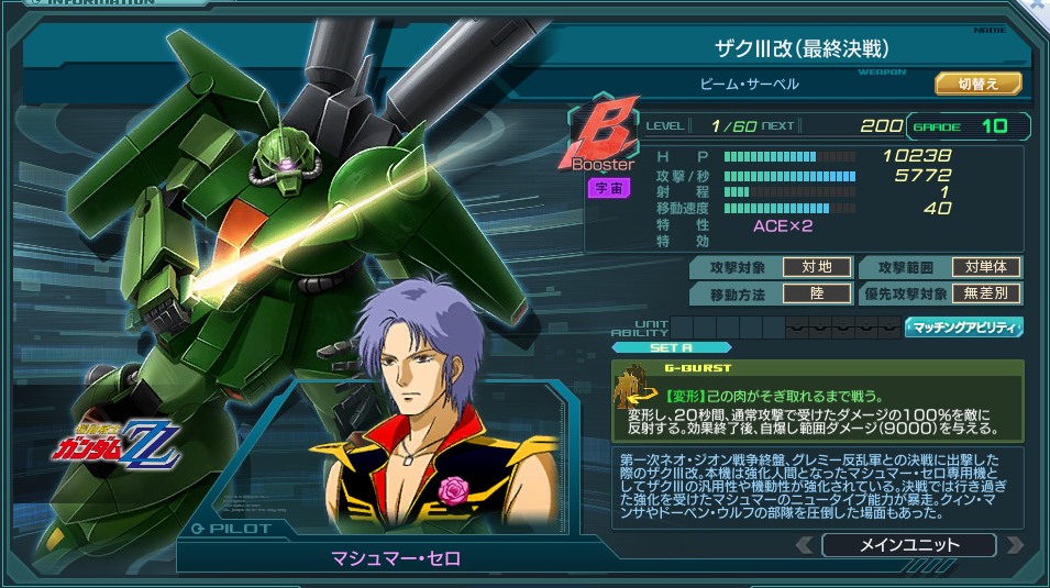| Booster | 特性 | 貫通 必中 通常攻撃と攻撃Gバーストからの受けるダメージ上限:500 ACEx3 | ||