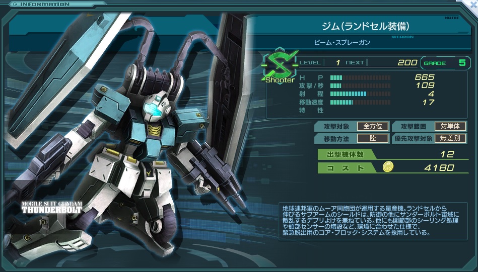 耐久力重視のS型機。ザクファントムの低グレード入手版といった感のある機体である。 MS開発が進んでいない場合、射程5機体の盾になるにはちょうど良いだろう。 壁として運用したい場合、Sの中では高めの移動速度も追い風。 反面、火力は同グレードのジムと比べても劣るので注意。