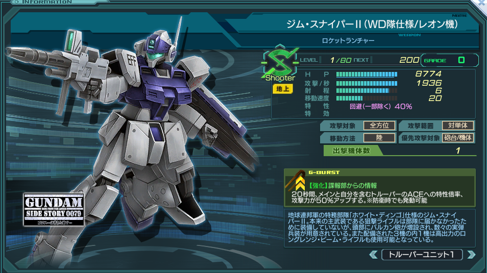 | Shooter | 特性 | 回避(一部除く)60% 命中60% 追加装甲(15000)x1 トルーパーの攻撃力+50% トルーパーの移動速度+30% ACE・MAx1.5 | ||