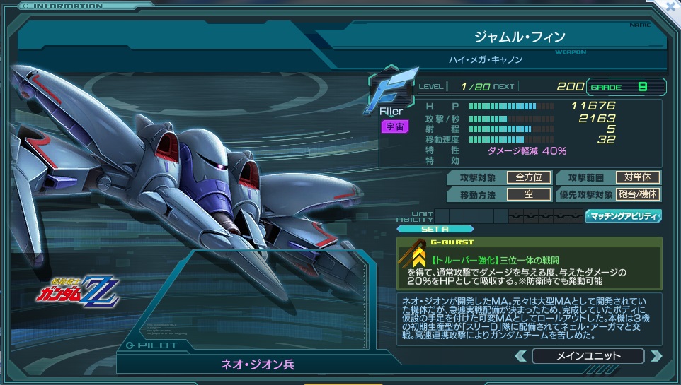 | 20秒間、自分とトルーパーの移動速度、攻撃速度が100% アップ、通常攻撃と攻撃Gバーストからのダメージ上限:4000 を得て、通常攻撃でダメージを与える度、与えたダメージの 20%をHPとして吸収する。※防衛時でも発動可能 | |||