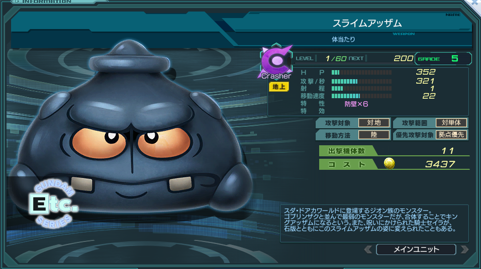 見た目はモデルとなった某有名RPGに登場するスライム同様に弱く見えるが、これでもHPは90とゴブリンザクよりかろうじて上である。
