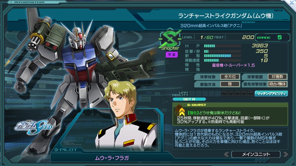 一覧 量産機 | エース | MA 最終ステータス 量産機 | エース | MA 比較データ エースGバースト | シリーズ別早見表 | 特性早見表| MS索引 赤字はレベルアップによるMAX値 基本ステータス