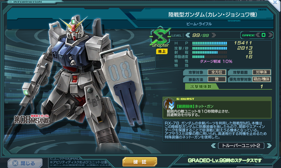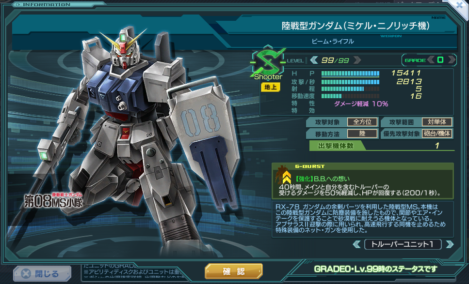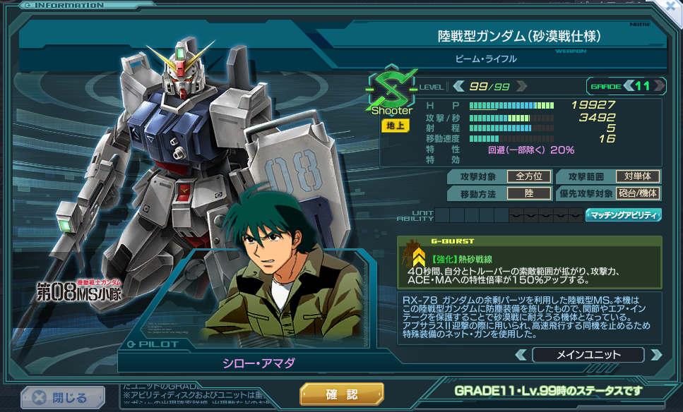 一覧 量産機 | エース | MA 最終ステータス 量産機 | エース | MA 比較データ エースGバースト | シリーズ別早見表 | 特性早見表| MS索引 赤字はレベルアップによるMAX値 基本ステータス