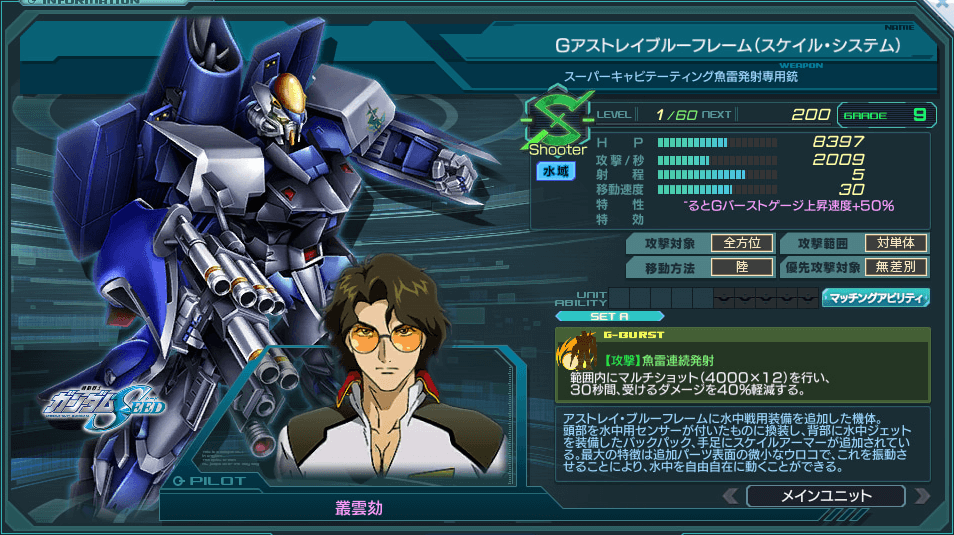 | Shooter | 特性 | 回避(一部除く) 50%、 「水域」に出撃するとGバーストゲージ上昇速度、攻撃力、攻撃速度、 移動速度+50% | ||