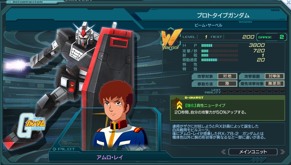 ツリー上の開発前提となる陸戦型ガンダムと比べると、基礎スペック向上の代わりにGバーストが自己強化型になっている。