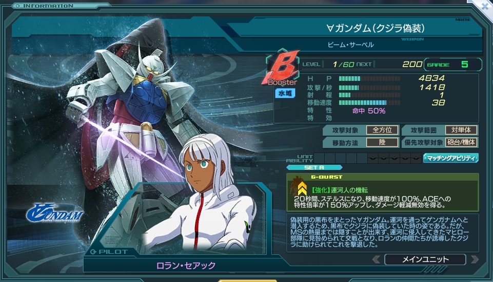| Booster | 特性 | 回避(一部除く)70% 命中50% ダメージ軽減60% ステルス状態の敵も索敵できる 攻撃前の待機時間無し HP回復(750/1秒) ACE×1.5 | ||