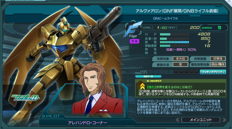 一覧 量産機 | エース | MA 最終ステータス 量産機 | エース | MA 比較データ エースGバースト | シリーズ別早見表 | 特性早見表| MS索引 赤字はレベルアップによるMAX値 基本ステータス