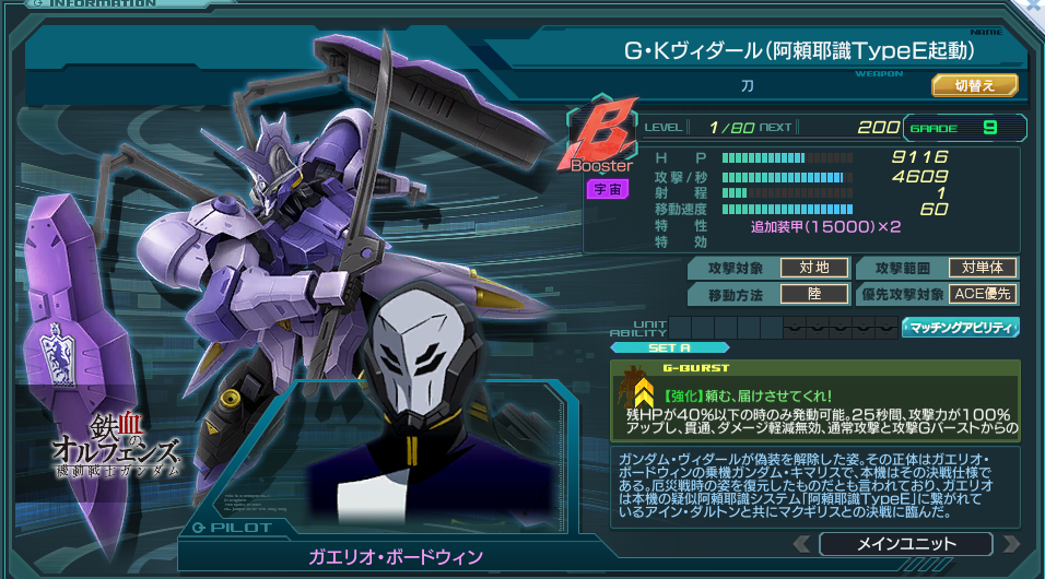 | Booster | 特性 | 命中50% ひるまない 攻撃前の待機時間無し 追加装甲(15000)x2 残HPが40%以下になると一度だけGバーストゲージが100%上昇する※変形後も状態を引き継ぐ 防壁x2 ACEx2 | ||