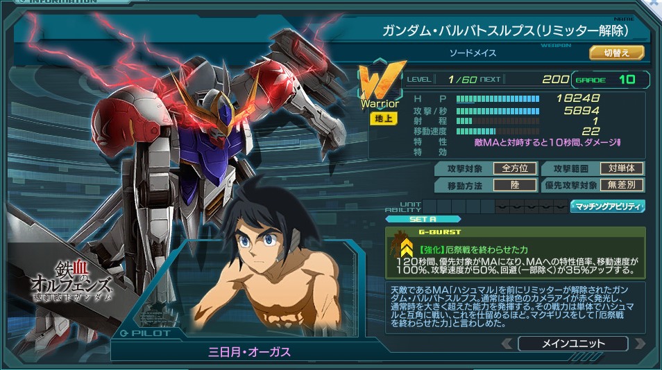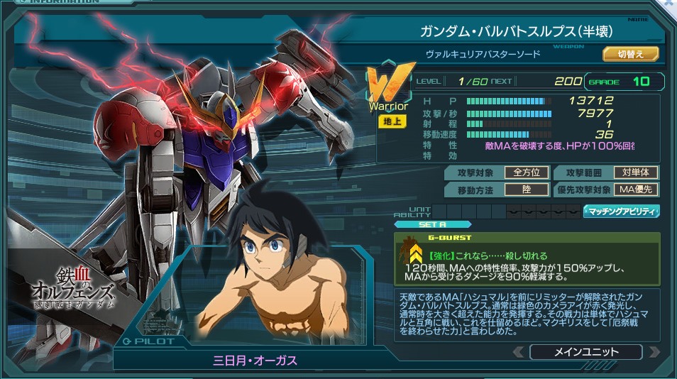 | Warrior | 特性 | 回避(一部除く)50% 必中 反射・砲撃・継続ダメージ軽減100% ひるまない 敵MAと対峙すると10秒間、ダメージ軽減無効を得る。※発動毎にリセット、分離後も状態を引き継ぐ 敵MAと対峙すると10秒間、吸収無効を得る。※発動毎にリセット、分離後も状態を引き継ぐ 敵MAと対峙すると10秒間、通常攻撃と攻撃Gバーストからのダメージ上限:2500を得る。※発動毎にリセット、分離後も状態を引き継ぐ 敵MAを破壊する度、HPが100%回復する。 MAx2 | ||