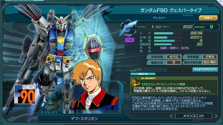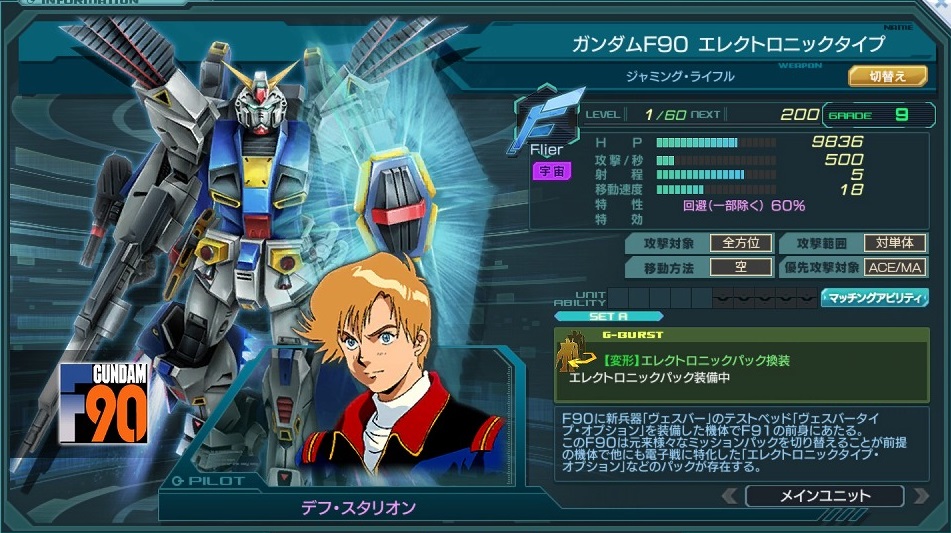 なお、本ゲームではデフ・スタリオンが乗るF90にVタイプおよびEタイプが装備されているが、Vタイプはベルフ・スクレット(宇宙世紀0122年時におけるF90のパイロット)が搭乗した時に装備されているのが確認でき、またEタイプも宇宙世紀0112年に存在したF90テストチーム「ファステストフォーミュラ」所属パイロットであるパッツィ・アンゲリカが搭乗していたF90・2号機に装備されていたのが確認されており、「デフ・スタリオンが乗るF90のVタイプ装備およびEタイプ装備」は実のところ、本ゲームオリジナルと言える。