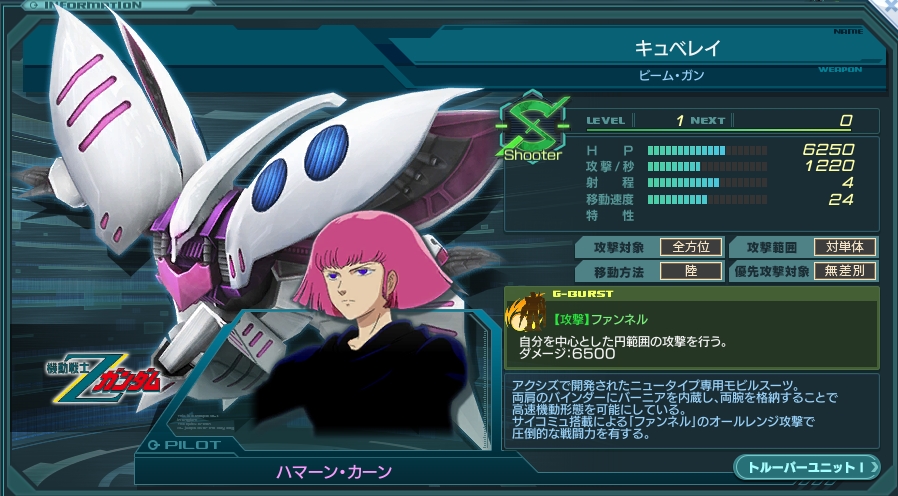 • G11来たからわくわくして強化・使用してみたら…専Gのトルーパー初期配置と違う火力だった事に気が付いた…専アビの効果はきちんと乗ってるが、何故別物のファンネルが出るんだと…。ので、G11からのステしか取ってなかったので一応載せ載せ -- 2021-02-28 (日) 13:03:48