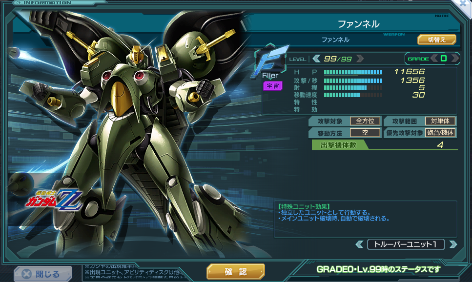| ファンネルを4機呼び出す。20秒間、 通常攻撃と攻撃Gバーストから受けるダメージの上限:3500を得て 出撃中の味方ユニットの攻撃力、攻撃速度が30%アップする ※防衛時でも発動可能 | |||
