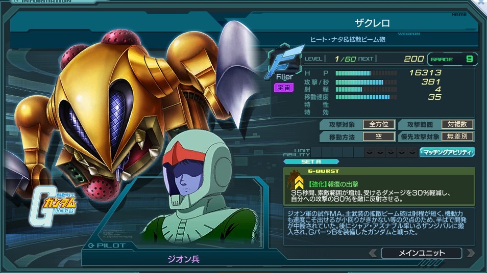 一覧 量産機 | エース | MA 最終ステータス 量産機 | エース | MA 比較データ エースGバースト | シリーズ別早見表 | 特性早見表| MS索引 赤字はレベルアップによるMAX値 基本ステータス