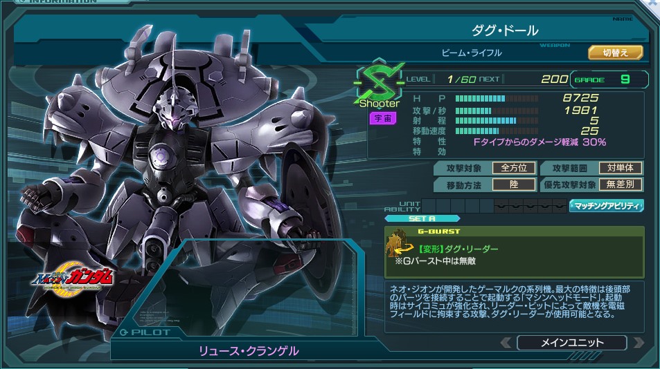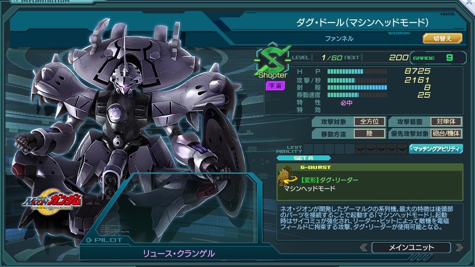 | 25秒間、変形する。10秒間、その場に留まり、範囲内の敵の行動を停止させ、 継続ダメージ(1000/秒)を与える。※Gバースト中は無敵 | |||