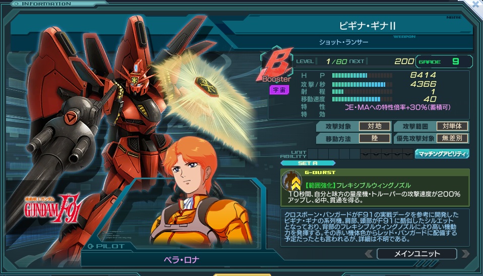 | Booster | 特性 | 回避(一部除く)60% 命中40% 追加装甲(20000)×1 Gバーストを使用する度、ACE・MAへの特性倍率+30%(蓄積可) 追加装甲が全て破壊されるまでダメージ軽減+50% 追加装甲が全て破壊されるまでGバーストゲージの上昇速度+400% 全施設×1.5 | ||