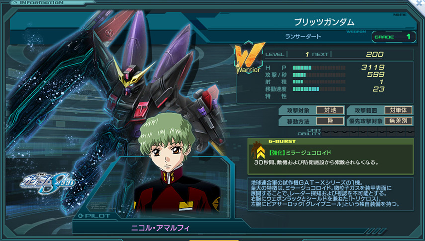 ガシャステーション入手機体の1つ。 入手時点ではグレード1だが、グレード5までテクニカルラボでの強化が所要時間10秒・レアチップ消費なしで行える(資金は必要)。 Gバーストがミラージュコロイドになったブリッツガンダム。 ガンダムデスサイズと同様のロック外し効果を持つので、勝負所で発動できれば効果は絶大。 ただし無敵になるワケではないので、ロック外し中も迫撃砲やガンタンクの攻撃の巻き添えになるとダメージを負う点に注意。 スペックは同グレードならば通常のブリッツガンダムを上回る他、密かに生産優先が外れて無差別になっているので砲台破壊にも使える。