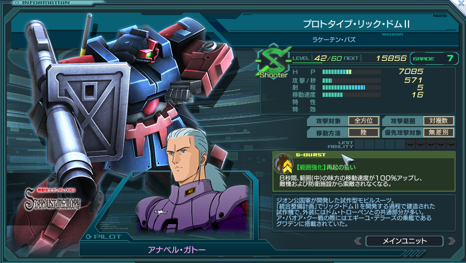 一覧 量産機 | エース | MA 最終ステータス 量産機 | エース | MA 比較データ エースGバースト | シリーズ別早見表 | 特性早見表| MS索引 赤字はレベルアップによるMAX値 基本ステータス