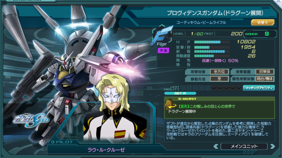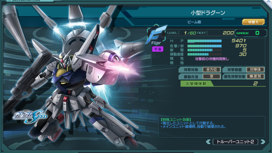 | 30秒間、変形し、ドラグーンを5基展開、自分かトルーパーが 敵を破壊する度、攻撃力が2%、攻撃速度が1%アップする。(蓄積可) ※防衛時でも発動可能 | |||