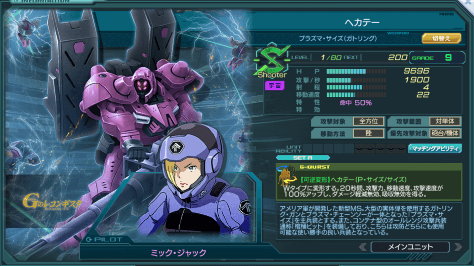 | Shooter | 特性 | 命中50% ダメージ軽減50% 追加装甲(25000)x1 追加装甲が受けたダメージの合計が2500以上になる度、ACEへの特性倍率+5%(蓄積可)※変形後も状態を引き継ぐ Gバーストを使用する度8秒間、ステルスになる。※発動毎にリセット | ||