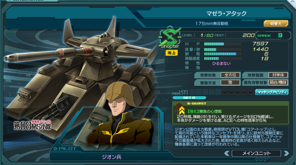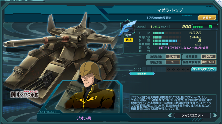 一覧 量産機 | エース | MA 最終ステータス 量産機 | エース | MA 比較データ エースGバースト | シリーズ別早見表 | 特性早見表| MS索引 赤字はレベルアップによるMAX値 基本ステータス
