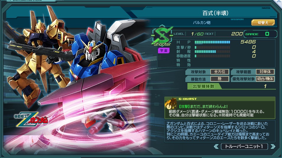 一覧 量産機 | エース | MA 最終ステータス 量産機 | エース | MA 比較データ エースGバースト | シリーズ別早見表 | 特性早見表| MS索引 赤字はレベルアップによるMAX値 基本ステータス