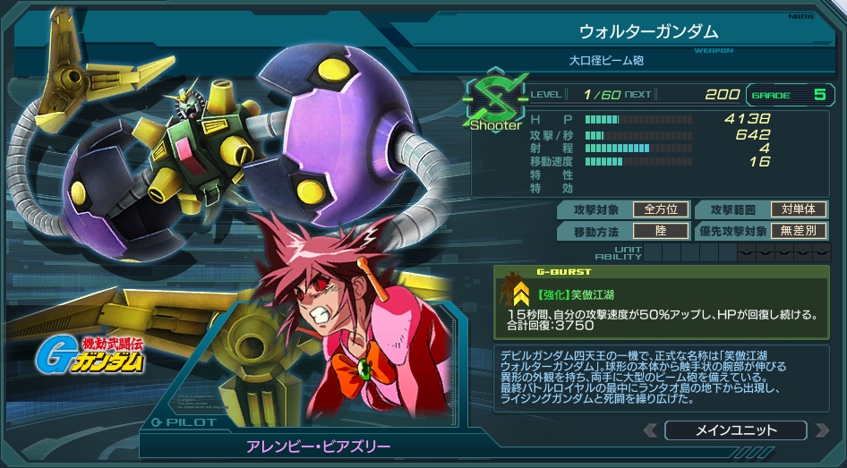 射程4S型としてはかなりHPが高く、回復できるGバーストもあるため生存力が特徴。