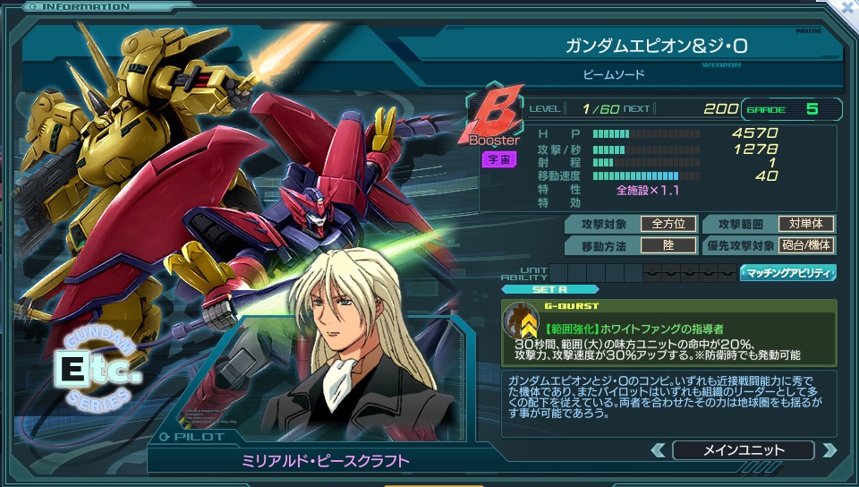 | Booster | 特性 | 回避(一部除く)40% 命中20% 全施設×1.1 ACE×1.2 | ||