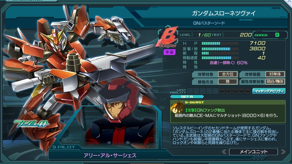 | Booster | 特性 | 回避(一部除く)60%、命中50%、 回避成功時、3秒間、Gバースト上昇速度+50%※発動毎にリセット 砲台×1.5、ACE・MA×1.3(※G11時ACE・MA×1.5) | ||