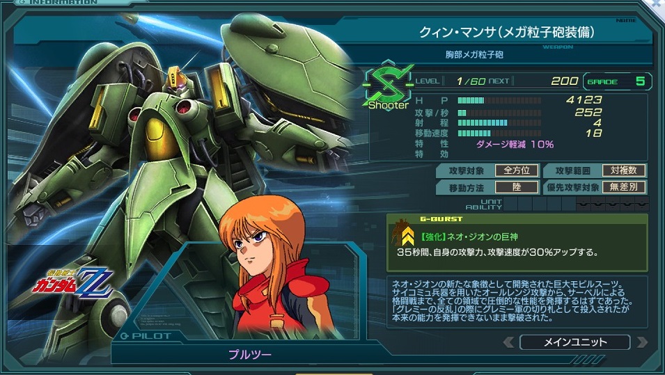 専用Gバーストを使用すると、半径約6マスの自身中心円範囲攻撃後にファンネル4機を呼び出し、本体の攻撃/秒と移動速度がアップする。