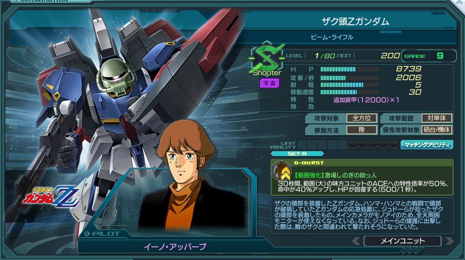 | Shooter | 特性 | 回避(一部除く)50% 追加装甲(12000)x1 味方ACEと出撃すると一度だけ、移動速度が50%アップする。 味方ACEと出撃すると一度だけ、攻撃速度が50%アップする。 出撃または配備後30秒間、味方ACEの攻撃速度が40%アップする。 | ||