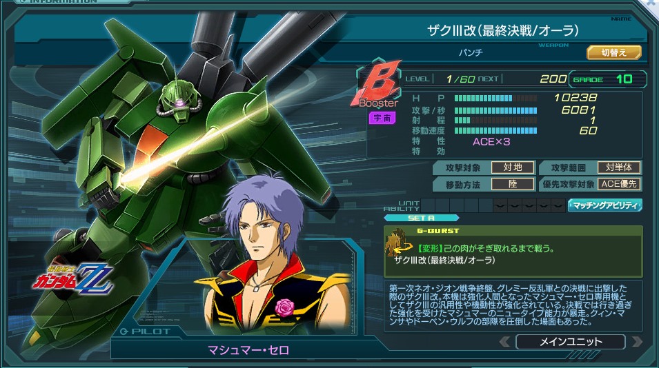 | Booster | 特性 | 貫通 必中 通常攻撃と攻撃Gバーストからの受けるダメージ上限:500 ACEx3 | ||